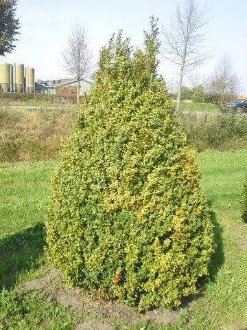Buxus sempervirens geknipt in pyramide vorm.