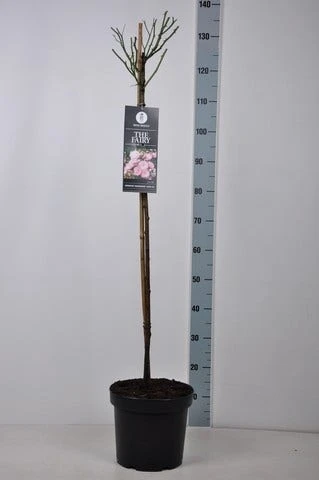 Rosa ‘The Fairy’ gekweekt als stamroos, een bekende trosroos met een roze bloemkleur.